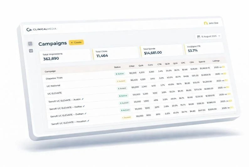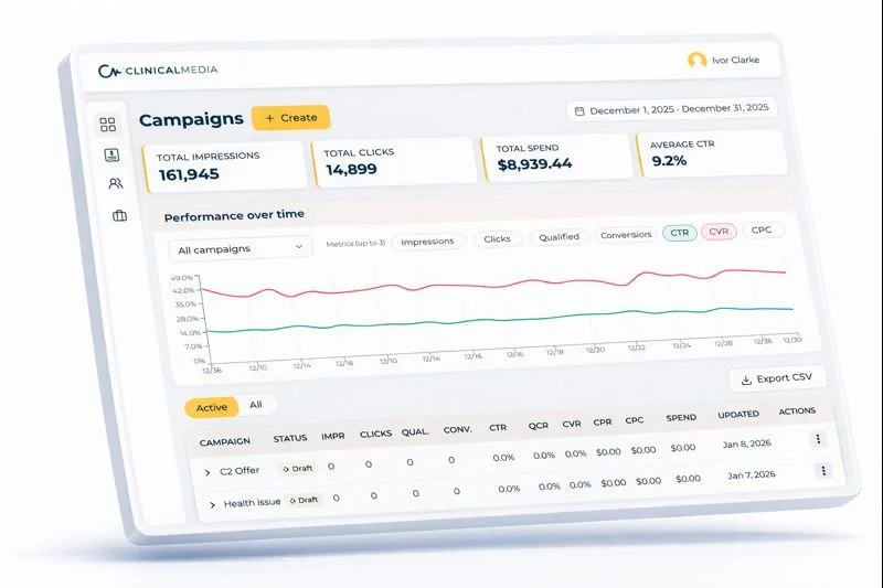 Clinical Media makes it easy to launch and scale high-performance healthcare campaigns using familiar targeting controls and a simple CPA pricing model.