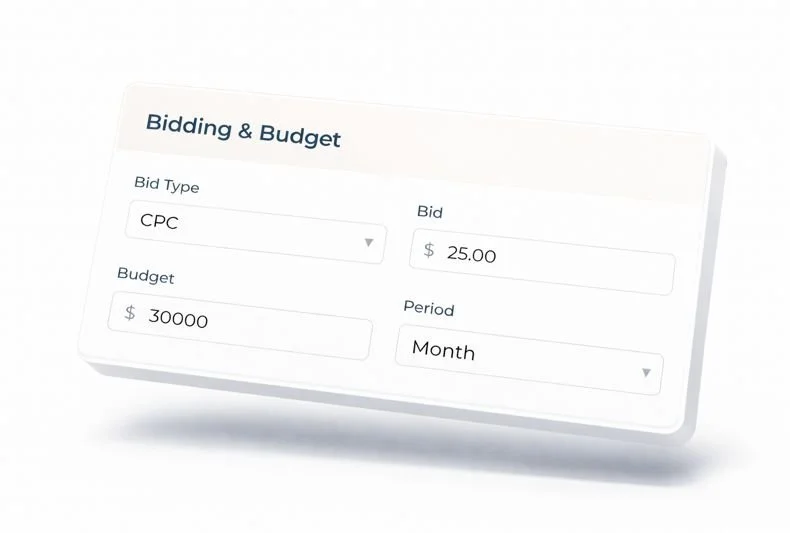 Choose your campaign goal: Clicks or Leads. Set your budget, bid strategy, and timeline with no minimum spend or long-term commitments required.